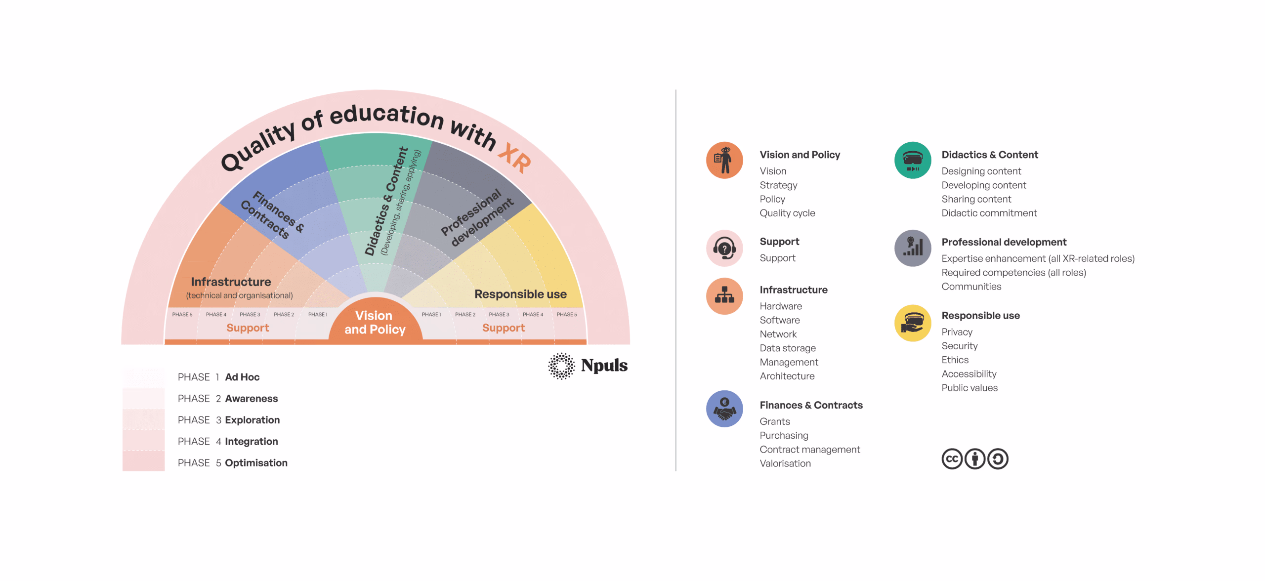 The XR Framework provides an overview of seven core themes that encompass all aspects needed to organise and facilitate XR implementation. These themes cover the entire adoption process, from policy development and infrastructure to support and practical application. The accompanying toolbox equips educational institutions with practical tools and strategies to support and streamline the effective introduction of XR.
